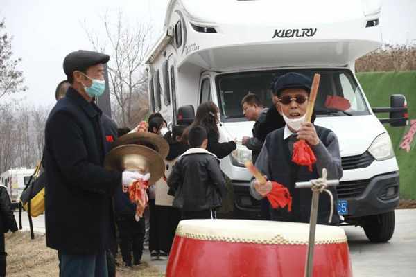锣鼓队正在上演古朴热烈的房车出发仪式