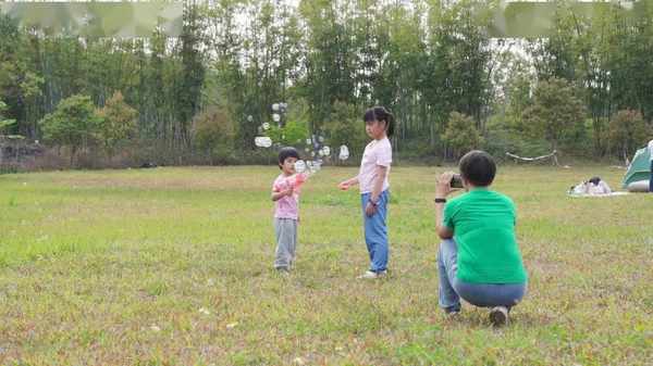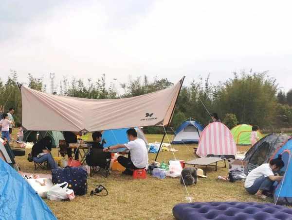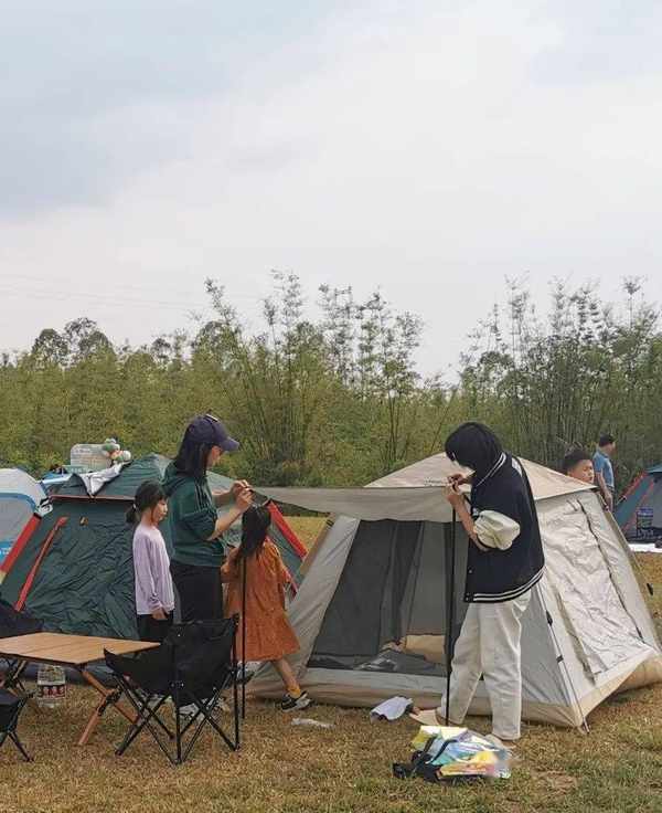 一番忙碌后,一个个帐篷在草地上支了起来,犹如一朵朵彩色蘑菇遍地盛开,从空中俯拍,也有着不同的画风。帐篷营地里,很多家长拿着坐垫,在帐篷外席地而坐,一家大小吃着水果,玩着游戏,吹着泡泡,其乐融融。不少游人三五知己、两三个家庭组合,一起结伴而来,带着露营桌椅饮茶、野餐,叙感情,增进朋友间的感情。