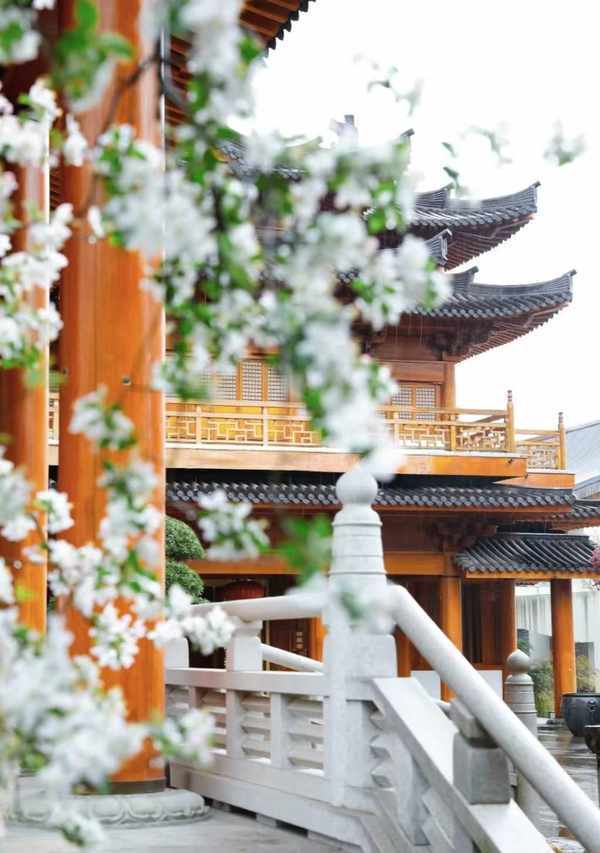 错过了寺院的梅花季,那就赶一场海棠花盛开季吧!海棠的纯白与寺庙更配哦!在内殿两侧的海棠花已经全开,春风拂面,扑簌簌的吹落花瓣的唯美画面,太适合拍摄古风了。