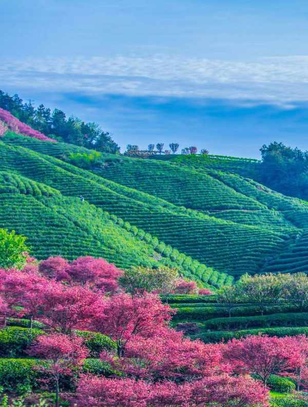 淡粉的樱花,散布在翠绿的茶园中,星星点点连成一片,一高一低,不过这里的樱花是晚樱,大约要在清明左右差不多会绽放,大家去的时候要注意时间,清明节左右茶叶也可采摘。