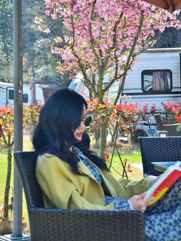 徐凫岩的房车营地中可选择樱花树边的房车,怒放的晚樱花成粉嫩色,极尽全力地绽放着美丽,透过阳光,人比花更娇艳!