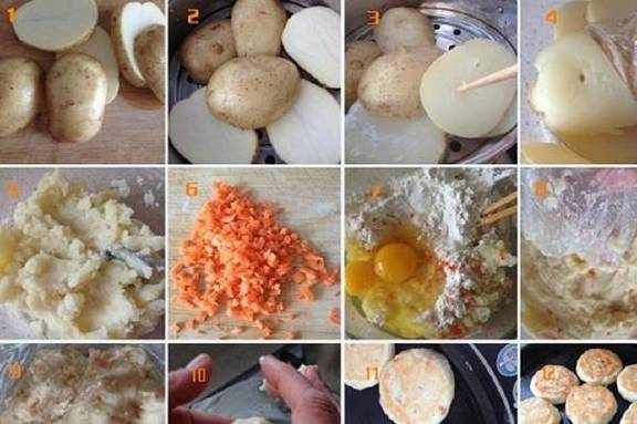 土豆2个糯米粉50克鸡蛋1个盐2g胡萝卜一根火腿一块