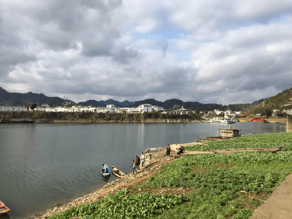 下图:刚上岸回望 新安 江,地里的油菜还是肥厚的大叶子,这时间的青菜非常甜糯,好吃。