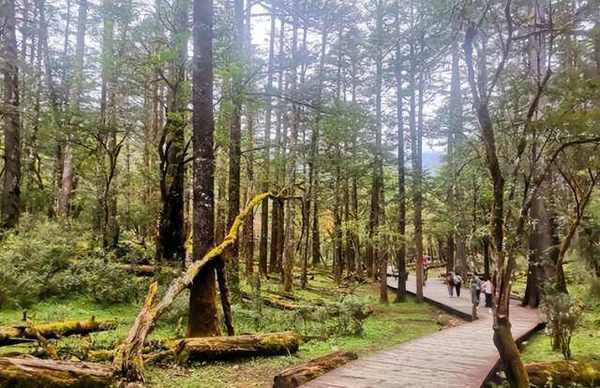 ,这个地方的景色又和前面的不一样,这里的树木生长的更为挺拔,高度更为明显,而这片树林之后就是挺拔的雪山。