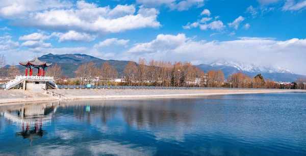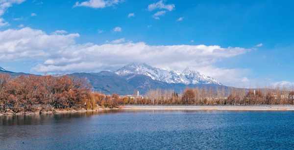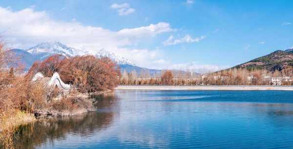 水库的水很清澈,可以看到远处的玉龙雪山。