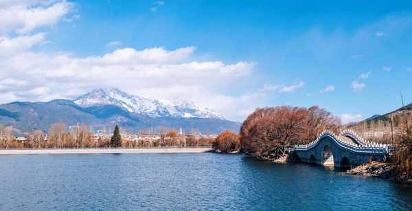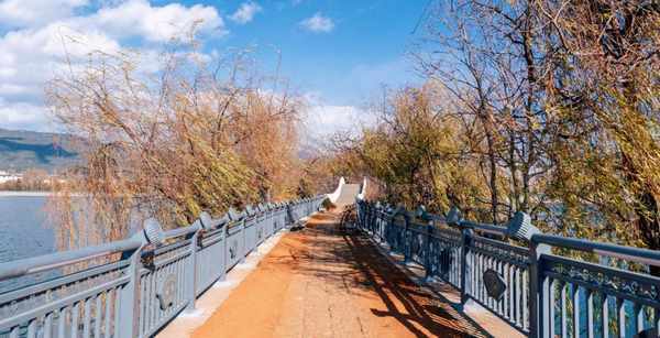 整个水库被水中长长的堤岸一分为二。堤岸树木茂密,树间有一座白色拱形石桥。配合着水库对岸的小亭子,仿佛走近了江南某位皇族。花园湖中,景色如江南水乡。