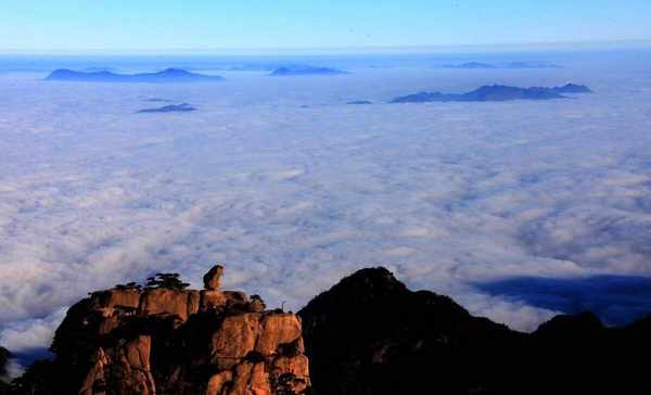 相传,在黄山北海景区有一处奇石景观叫“猴王观海”,也叫“猴王望太平”。它形似一只猴子站在悬崖上向远方眺望。
