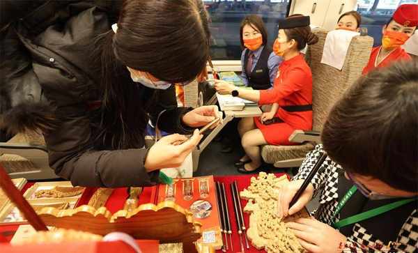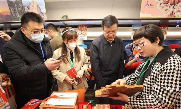 市文旅局工作人员介绍,本次参展,他们精心整合全市文化和旅游各项元素积极参与,还带来了山东鲁菜根餐饮管理有限公司用牛奶、蜂蜜、鸡蛋和面的泰山祈福喜馍馍,丰富多样的文旅产品让体验者驻足观赏、流连忘返,饱尝一份高铁上的文旅大餐。