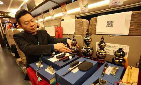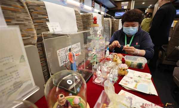 走进8号车厢泰安市文旅精品展,在泰山景区参展区域,装扮成皇帝、皇后的演员早已准备就绪,有条不紊地为大家展示礼仪、讲解泰山封禅大典的相关典故,同时,泰山景区还展示了《泰山名碑集粹》《泰山金刚经缩印本》、制作精美的《走进泰山》画册及无恙堂泰山黄精,弘扬传播泰山文化,也让体验者感受到不一样的泰山。紧随其后的是泰山石家面塑展示位,泰山石家面塑第七代传承人石洪令“闹中取静”,沉浸在面塑的世界中。调成不同色彩的面泥在她的手中经过揉、搓、迭、捻,再用简单的工具进行剪、点、捏,就变成了细腻精巧、惟妙惟肖的面塑作品。除泰山祈福娃娃、瑞虎送福、仕女人物等面塑作品,石洪令还专门为此次活动带来了手举“中华泰山国泰民安”和“行走百年胶济高铁环游齐鲁”logo的玉兔面塑,风格多样的面塑吸引着络绎不绝的参观者驻足欣赏。