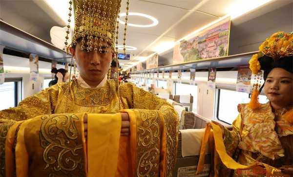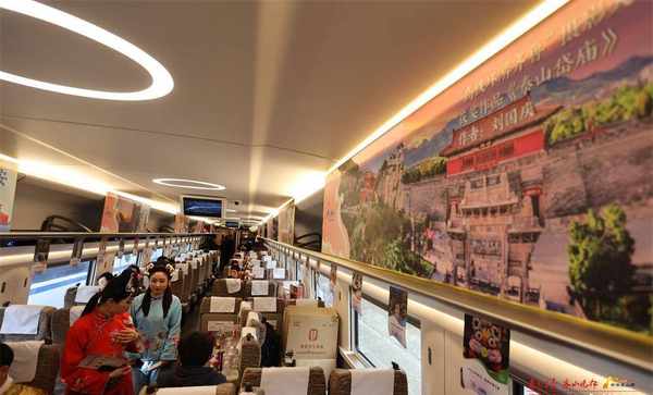10时25分,首趟冠名列车缓缓从济南西站驶出,开启体验之旅。本次冠名列车从济南西站出发,沿胶济客专驶往青岛,经青盐铁路开往日照,通过日兰高铁到达曲阜后进入京沪高铁,最后返回济南西站。作为齐鲁大地上的第一条铁路,胶济铁路从1904年全线通车至今,在沿途留下了诸多文化遗产,成为一条重要的山东文化廊道,串联起美丽的齐鲁大地。本次活动,500多名体验游客和媒体记者现场观摩山东16地市“一市一车”文旅精品展览,领略沿胶济铁路文化体验线独特魅力和各地市文化旅游特色。