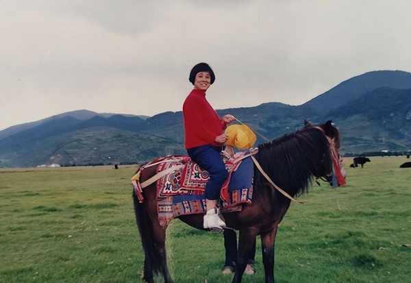 第二天上午,我们去高原湖泊碧塔海。海子位于距中甸县城25公里外的深山密林间,海拔3539米,平均水深20米,最深处40米。踏着由圆木铺成的路穿越密林,来到碧塔海边。青山环抱着绿水,广阔的草原上,牛儿马儿在吃草,好一幅田园牧歌图 。碧塔海湖水那真是清澈啊,一眼能望到底,如同镜子一般照出人影来。可惜有船没人开,只能在湖边上看看湖底的水草。岸边的大片草地上,可以骑牦牛,我穿上藏族服装,骑在牦牛上照个像,也算体验了一把异域风情。回程的路上,我们每人骑一匹马,每人23元钱,藏民牵着马气喘吁吁艰难地走在泥泞的山路上。我骑在马上,一晃一晃的,心里有点紧张。眼前的森林景色顾不得看了,只是牢牢抓住缰绳,怕从马上掉下来。