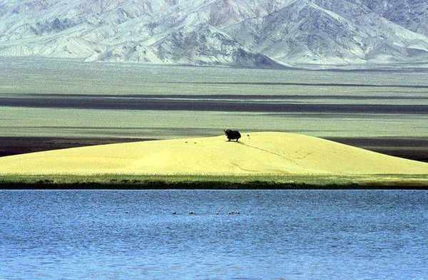 在若羌县东南部的昆仑山腹地,平卧着一个神奇的大湖,它是西藏、青海和新疆三省交界处最大的一个湖泊,长42公里,宽11公里,面积340平方公里,湖面海拔高达4718米,湖深2-20米。这个高山平湖是经卫星拍摄照片和地质工作实地调查后才发现的,湖水与雪山冰峰相互辉映,湖的形状恰似一条横卧着的肥大鲸鱼,头东尾西,故而得名“鲸鱼湖”。