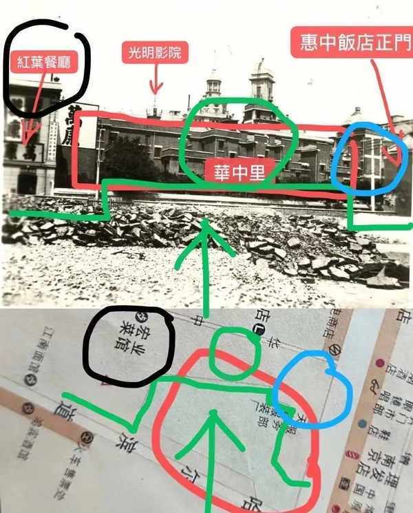 惠中饭店,建于1930年。它的身后是同年建成的华中路,介于辽宁路与和平路之间。这条华中路很短,比杨福荫路还短。当年在这条路上只有两家门面,一家是惠中饭店的正门,另一家的门牌号是华中路15号,也就是宏业菜馆的所在地。不过现在早已遗迹无存了。