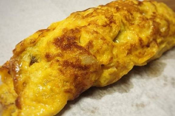 4.第二层卷起来后,稍等十几秒,待蛋液全部熟透,将其夹出放在厨房用纸上,吸去表面的油。