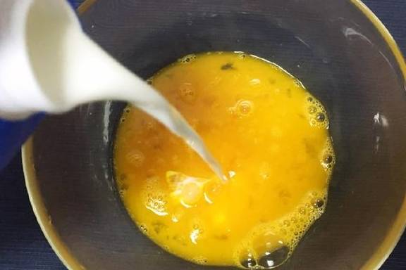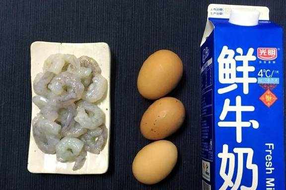 2.鸡蛋打散,倒入50ml牛奶,加入切好的虾仁粒,搅拌均匀。