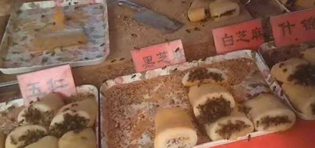 她将发酵好的糯米团擀平后,又在上面放上芝麻和白糖,然后将糯米团卷起来,用刀切成均匀的一大段一大段,为了满足很多顾客的需求,这里的糯米卷有多种口味可供选择,五仁馅的,什锦陷的等等。放在小吃摊上,看起来非常不卫生,我都怀疑,她是无证经营!