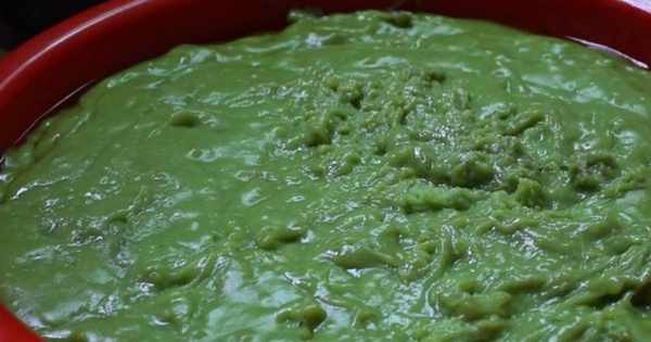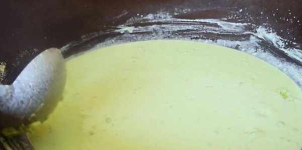 【步骤三】将打好的泥浆倒出来,然后倒入大锅中,不断地搅拌,这个搅拌的过程要持续半个多小时,中间千万不能断掉,要不然它是很容易糊掉。将糊糊连续搅拌半个多小时以后,再用小火焖煮10分钟左右。