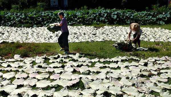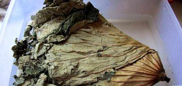 等到需要的时候就取出来放到水里清洗一遍,然后用水泡着,使其尽情的舒展开。处理好的荷叶就上锅了。现在要是这么做的话,这肯定是一道美餐。