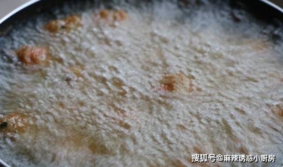 6、锅中加入足够的植物油,油温5成热的时候,放入丸子,小火慢炸,炸制金黄飘起捞出控油;