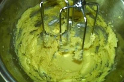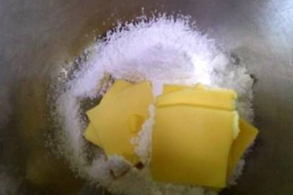 2.黄油软化,与糖粉一起倒入大碗,