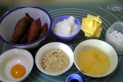 1.用料:黄油45克,糖粉27克,全蛋18克,低筋粉62克,杏仁粉20克,红薯7条,蛋黄1个,黑芝麻少许