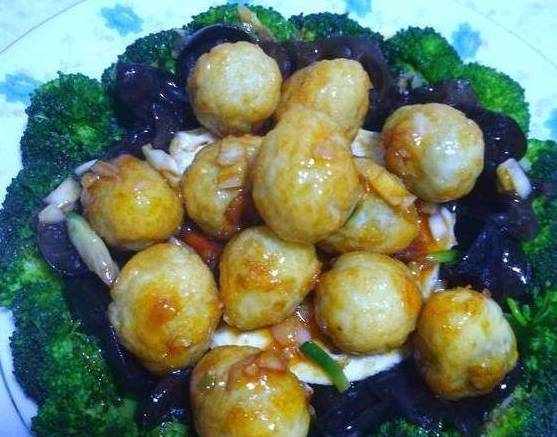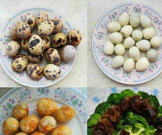 鹌鹑蛋煮熟、剥壳油炸成虎皮鹌鹑蛋备用。西兰花、黑木耳放入锅中焯熟,焯西兰花时,给水中加点盐滴几滴油,这样西兰花保持翠绿。把焯好水的西兰花和黑木耳如图摆盘。