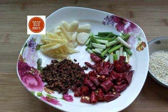 3、辣椒剪成小段,生姜切丝,葱切小段,蒜切片,花椒,芝麻备好。