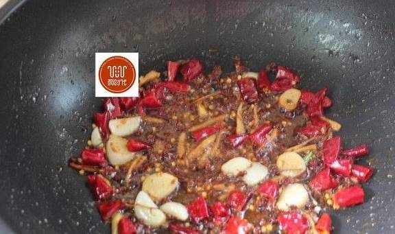 5、锅里留底油至7成热,倒入姜蒜小火炒出香味,加入干辣椒和花椒,翻炒出香味。
