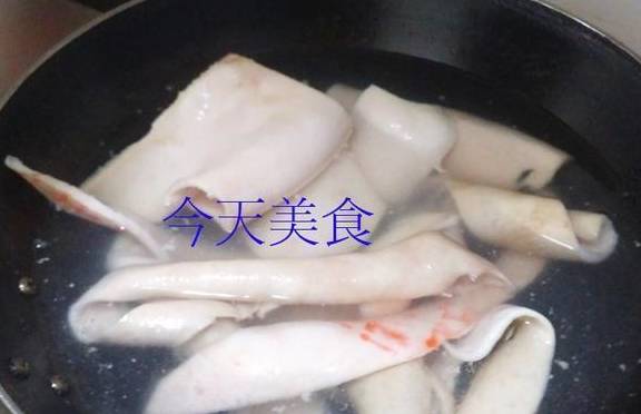 2、将大块的猪皮放入清水中将水煮沸,然后将猪皮捞出用温水再次清洗两遍,洗掉表面的油脂。用刀将猪皮内侧的肥油刮干净,一点都不要留,猪毛最好用小镊子处理干净。