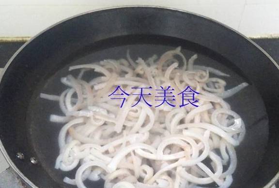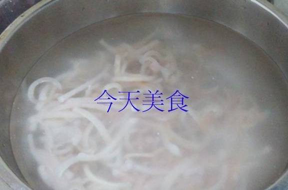 4、将切好的猪皮丝放入锅中,添入适量的清水,将水煮沸然后改小火。