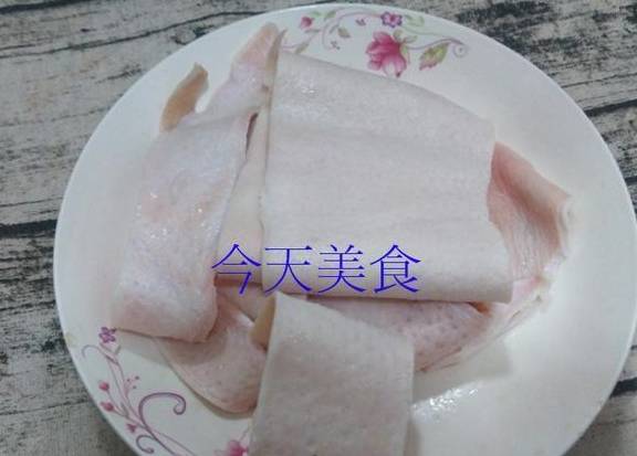 1、大块的猪皮先用水煮过再进行处理,一定要将猪皮内侧的油脂处理干净。