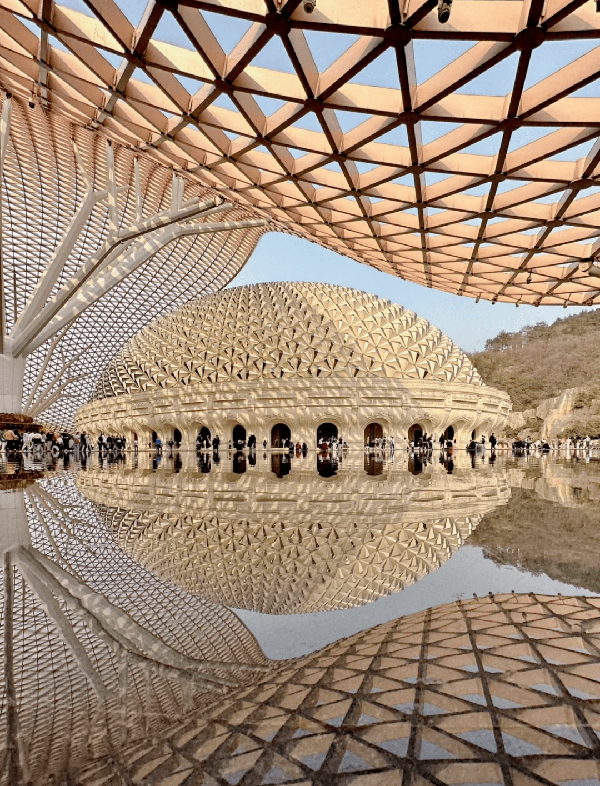双穹顶设计,如同一件袈裟覆盖在牛首山上。