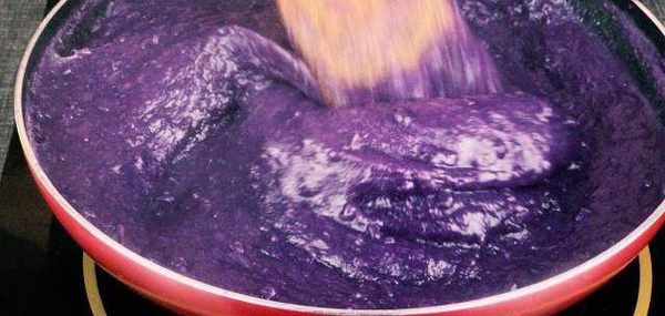 6锅中倒入大约500毫升的清水煮开,煮开后倒入压好的紫薯泥,不停的搅拌。