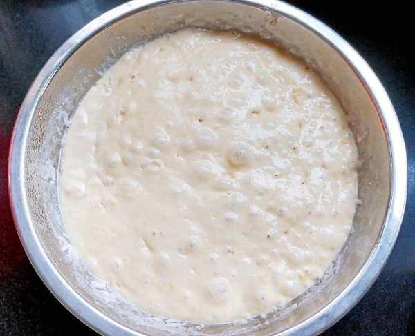这是早上从冰箱保鲜室拿出来的发酵好的面糊。