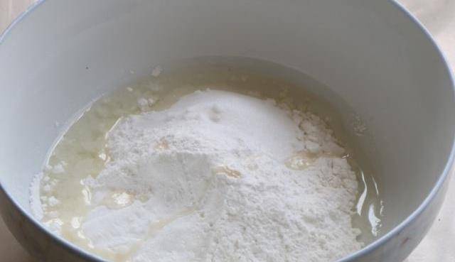1、 拿出一个稍大一些的容器,准备好之后将上面除了水、豆沙和椰蓉之外的食材都放在里面,放好之后将它们混合在一起。