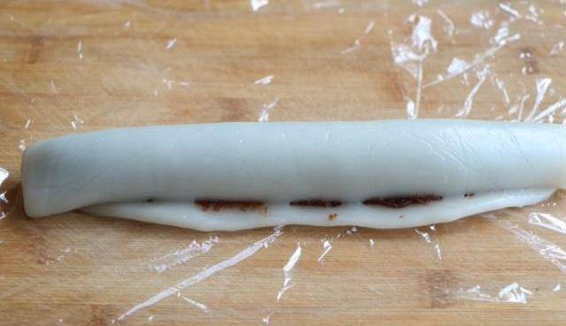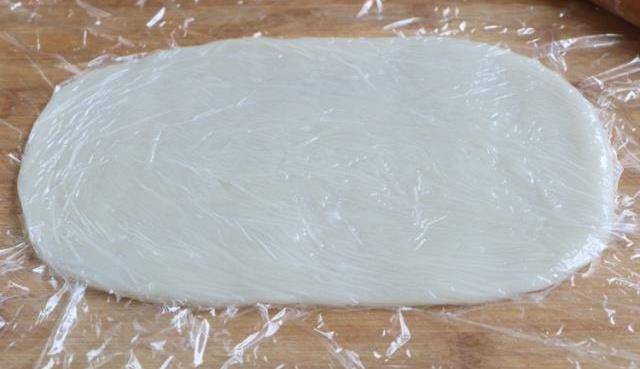 4、 时间到了就可以端出来了。在面板上铺上保鲜膜,把蒸好的糯米团放上去,稍稍的整理的平整一些,然后在上面再盖上一层膜,将其擀成长方形的片状,要擀的稍薄一些。