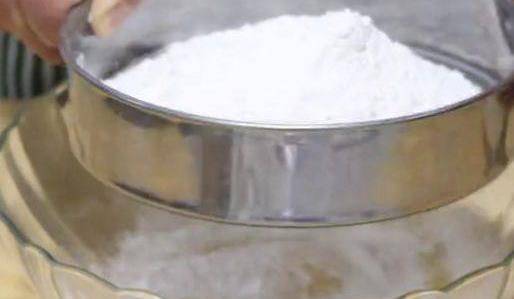 在低筋面粉里加入2克无铝泡打粉,搅匀,然后把面粉筛入到搅拌好的蛋液里。