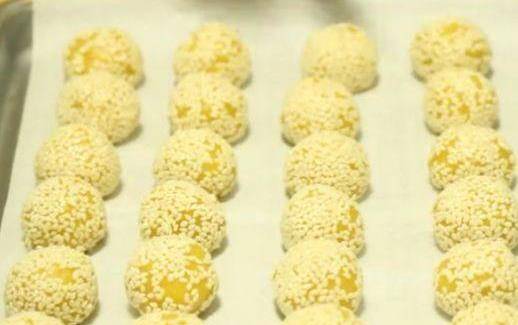 再烤盘里铺上油纸,芝麻倒进碗里。把醒好的面团粘上芝麻。