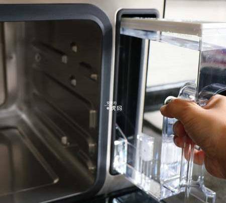 将西屋蒸烤箱的水箱里灌上纯净水,再放回原位,这个水箱的最大容量是1450ml;