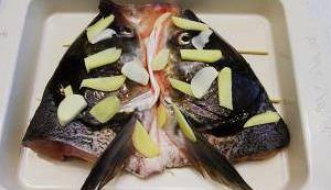 鱼头蒸三分钟后拿出来,去掉表面的姜片,将血水倒出。