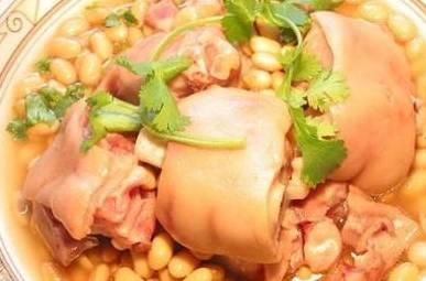 原料:猪脚(1000克)黄豆(400克)调料清水(适量)油(适量)盐(适量)。