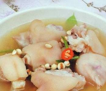 猪蹄有美容抗衰老的作用:猪蹄中的胶原蛋白质在烹调过程中可转化成明胶、它能结合许多水,从而有效改善机体生理功能和皮肤组织细胞的储水功能,防止皮肤过早褶皱,延缓皮肤衰老。所以女性朋友可以多吃点。