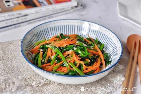 6、最后将焯过水的菠菜放入锅中,加入适量的盐,也可以加入少量的味精,大火翻炒均匀即可出锅。一盘健康营养又美味的菠菜炒胡萝卜就做好了。