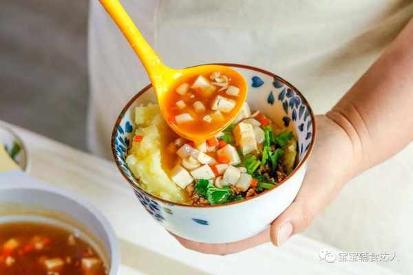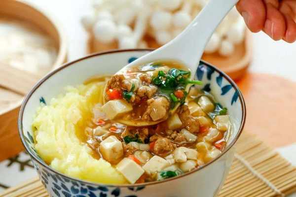 碗里依次铺上土豆泥、肉末、香菜,最后浇入汤汁,这碗浇汁土豆泥就能上桌了。