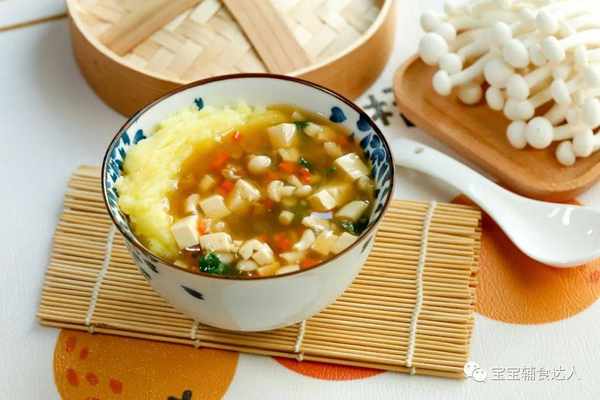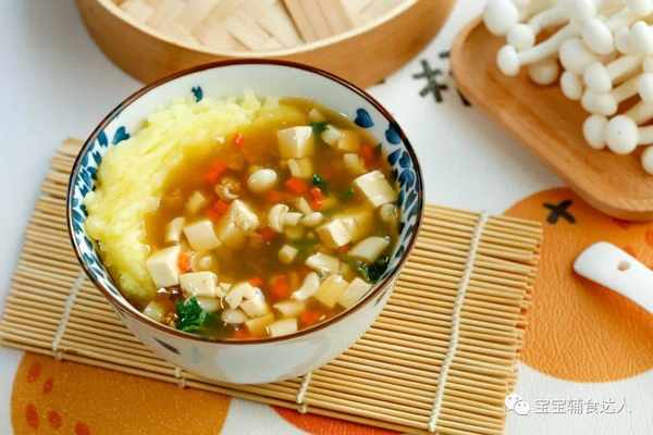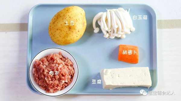 白玉菇、胡萝卜、豆腐都切成小丁,我这里就是给你们一个思路,具体的食材都可以替换的,只要孩子爱吃就行。