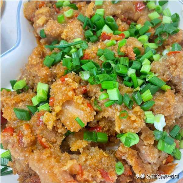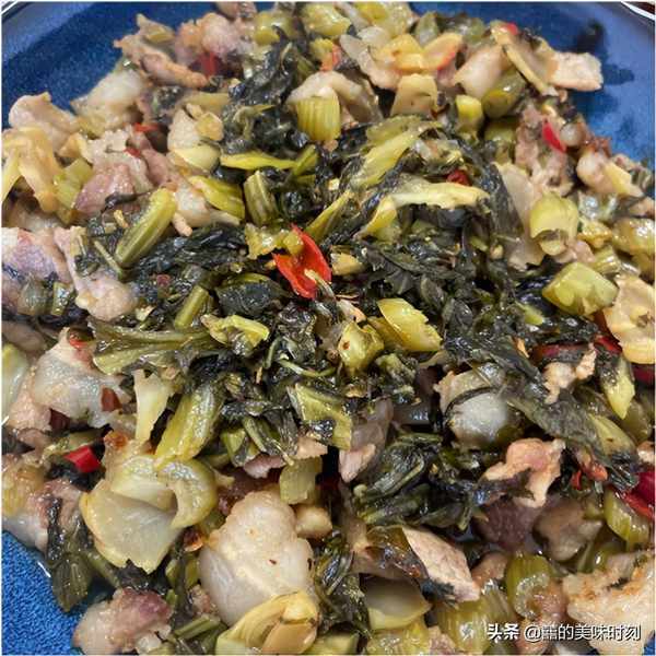 然后是这个酸菜炒肉,周子怡用的是五花肉,把五花肉切成薄片,炒到肥肉微卷,瘦肉入味,搭配自己腌制的酸芥菜,酸酸的辣辣的很开胃。还有这个粉蒸肉,也是周子怡自己做的,把粉蒸粉裹在五花肉上,蒸熟之后撒上葱花就可以吃了,虽然条件简陋,但是做法很地道,有熟悉的家乡味道。