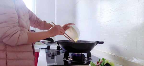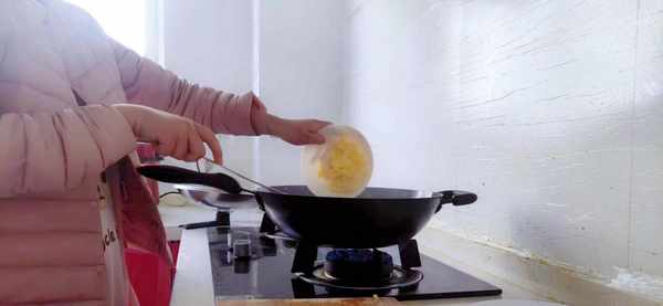 步骤二:开火,锅里加少许的清水,把搅拌均匀的蛋液倒进锅里快速的翻炒至鸡蛋变熟之后盛出备用。