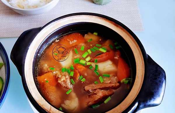 2、胡萝卜刷洗干净,山药去皮洗净,切差不多大小的块,放入排骨锅里炖10分钟,胡萝卜软烂,加盐调气质,关火焖10分钟即可食用。