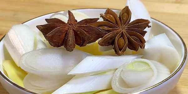 2、接下来就是准备辅料了,将生姜洗净切成片,大葱切成段,准备几颗八角,放在碗里备用。