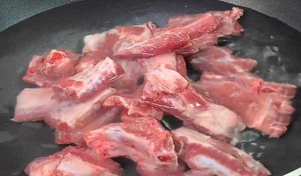 1、排骨用清水冲一下之后,起锅倒入冷水再放入排骨,将排骨焯一遍水,焯排骨的过程中开大火。排骨焯好之后,然后用温水将排骨冲洗一下。